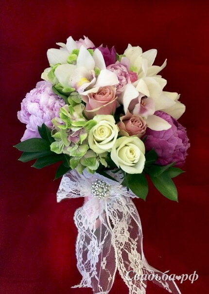 Модный, яркий, нежный, слегка небрежный букет, дополненный кружевом и изящной брошью с жемчугом. Пионы, гортензия, орхидея Цимбидум, розы, рускус.