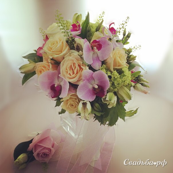 розы, альстрамерия, орхидея фаленопсис розового цвета, вибурнум, эустома