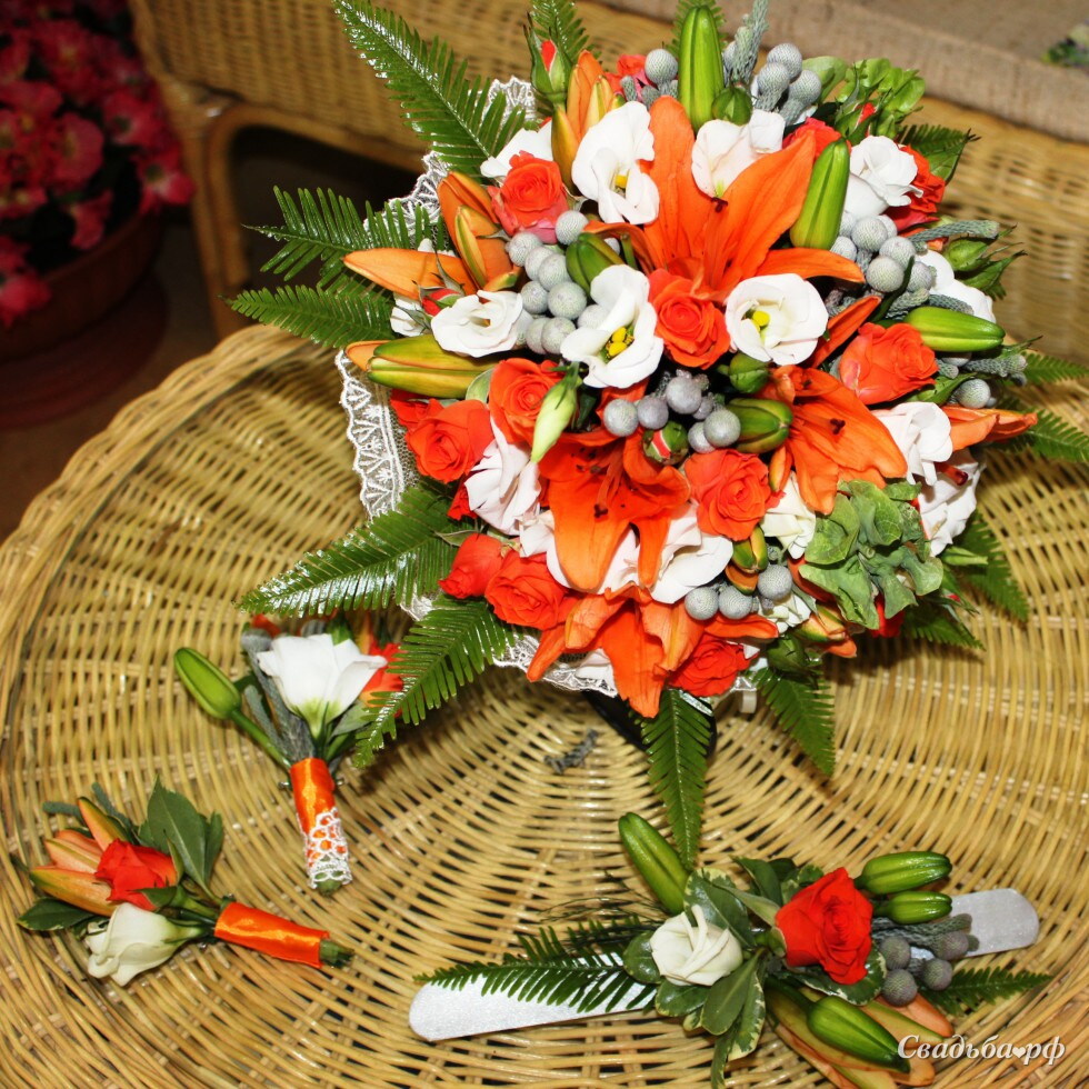 Букет невесты на портручке. Состав: оранжевые лилии, белая эустома, оранжевые розы Кении и декорат.зелень.