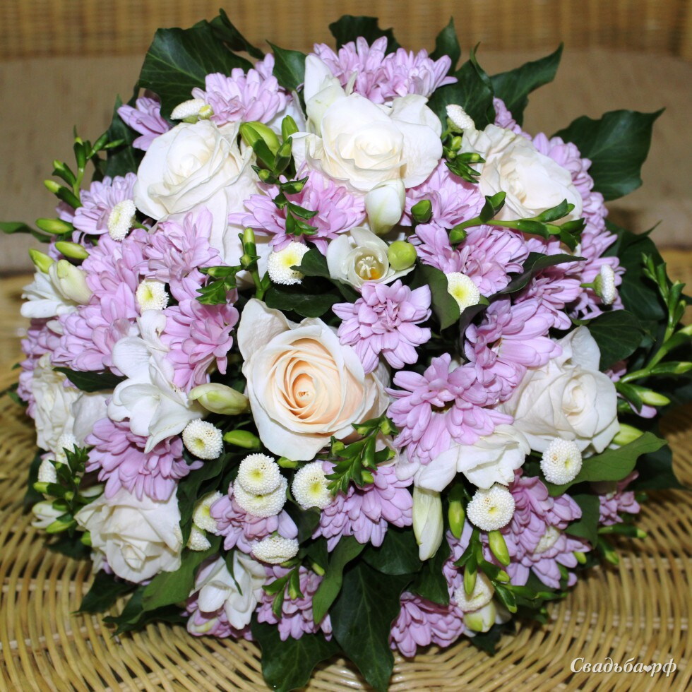 Букет на портручке. Состав: белая роза, сиреневая хризантема, белая эустома, фриезия, танацетум.