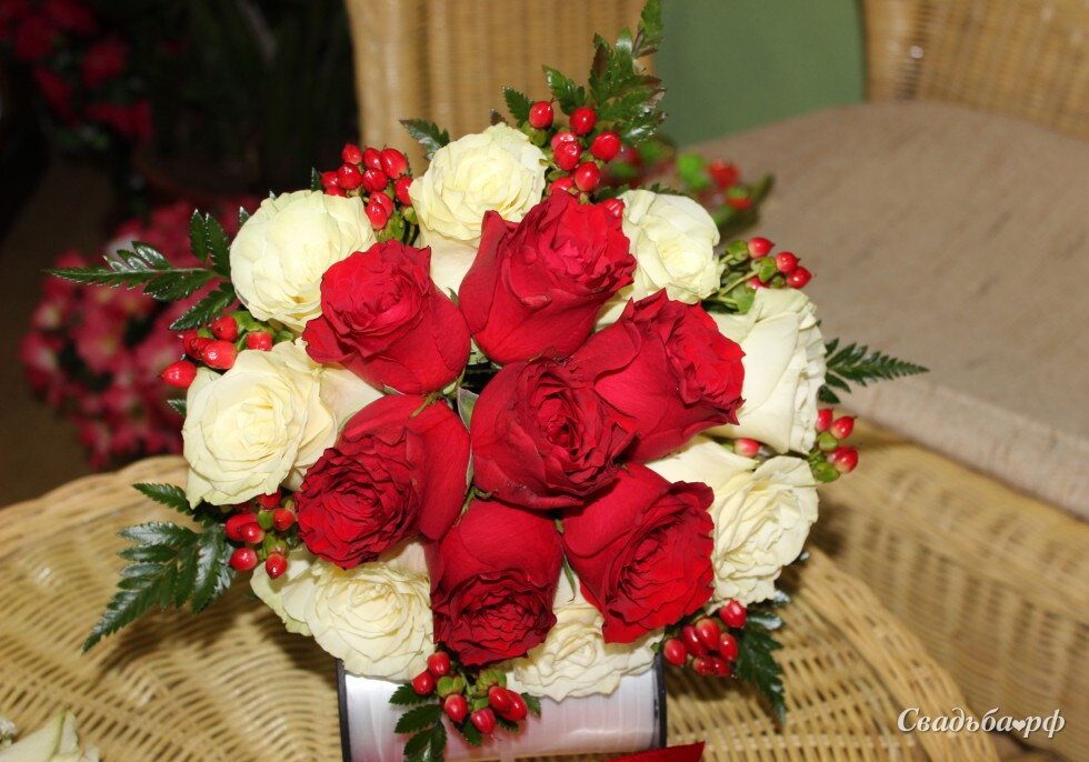 Букет из красных и белых роз на своих ножках. с добавлением красного гиперикума и папоротника.
