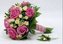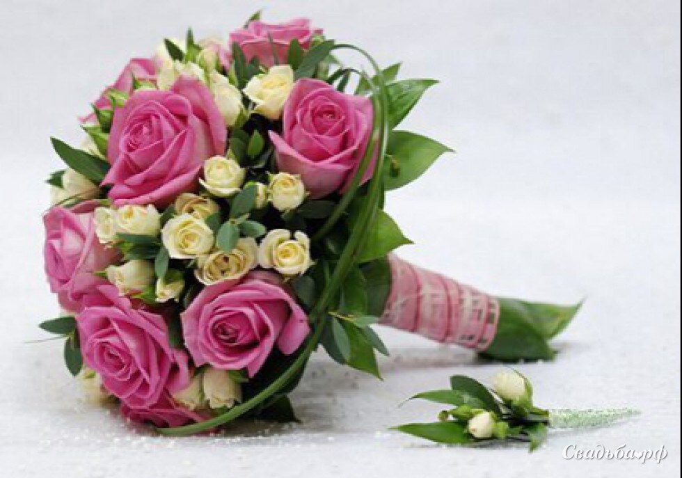 Букет из розовых роз и белых кустовых роз. в комплект входит бутоньерка для жениха.