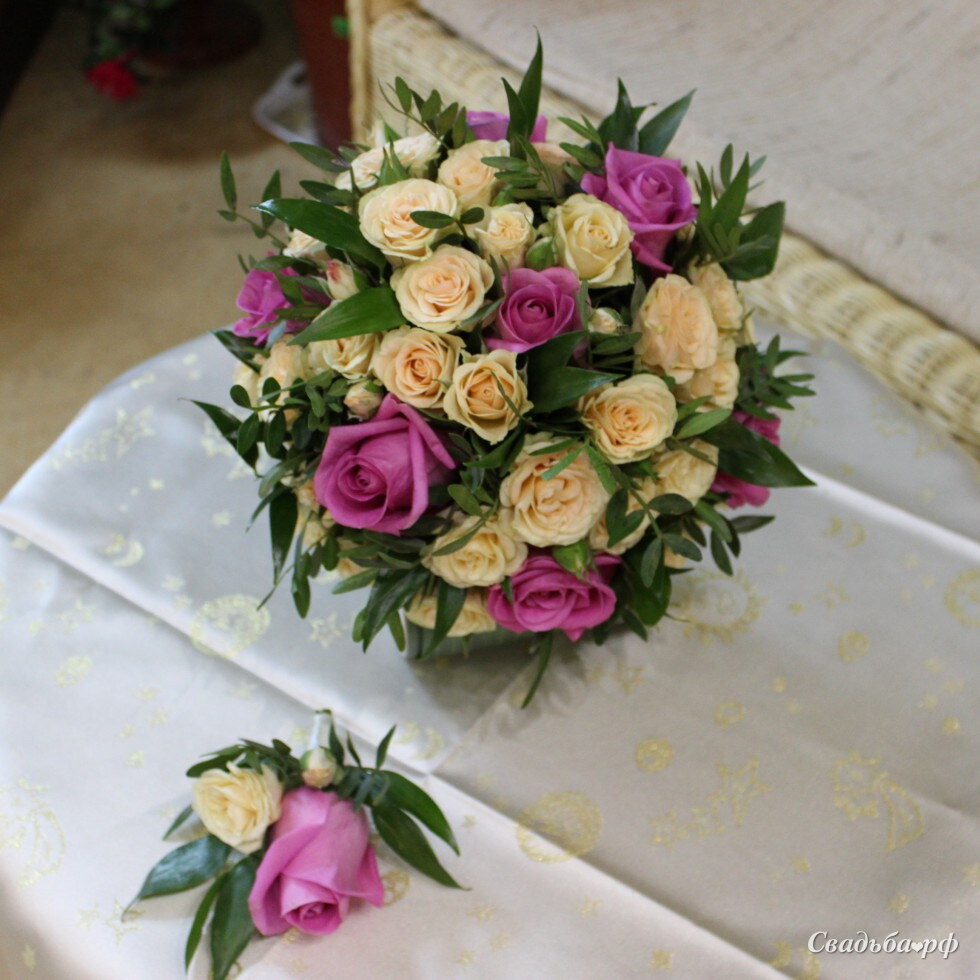 Букет на портручке из кремовых кустовых роз и одноголовых розовых роз. Бутоньерка в подарок!