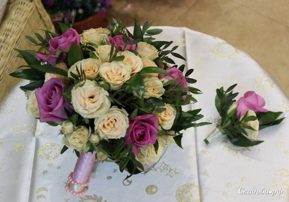 Букет из кремовых кустовых розочек и одноголовых розовых роз. Бутоньерка в подарок!
