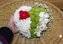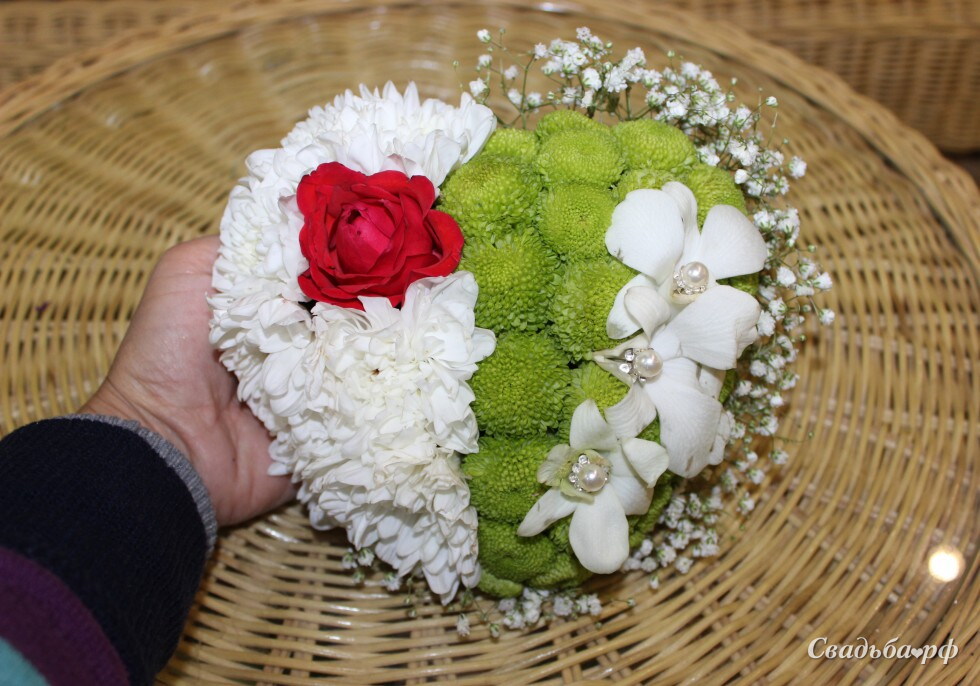 композиция в форме сердца из белых и зеленых хризантем, красной розочки и белого дендробиума. Отлично подойдет в качестве подушечки для колец.