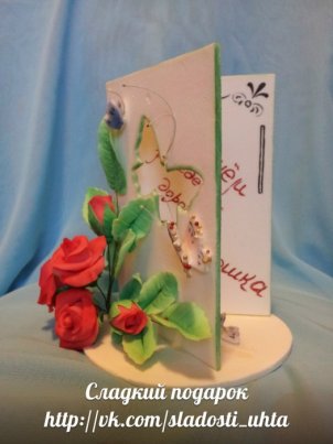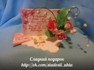 У нас представлены сладкие букеты из мастики, поздравительные открытки из пастилажа.