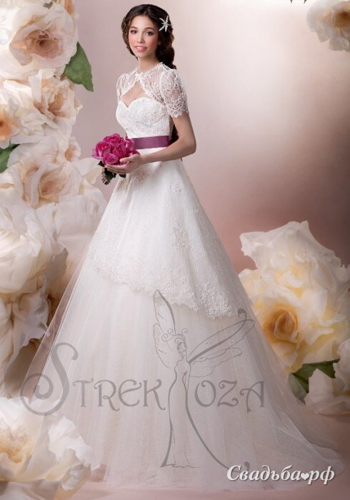 пышное платье со шлейфом и кружевной юбкой. Лиф украшен кружевным болеро, пояс выполнен из цветной ленты.