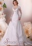 платье А-силуэта со шлейфом. Лиф выполнен из кружева и шнуруется на ленту. Платье с длинным кружевным рукавом.