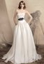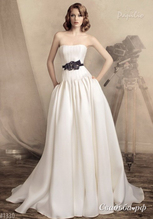 пышное платье со шлейфом и гладкой юбкой с карманами.лиф отделан бархатным поясом сиреневого цвета, украшенного жемчужинами Сваровски.