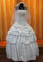 Лиф платья украшен стразами. Пышная юбка выполнена из кружева и тафты