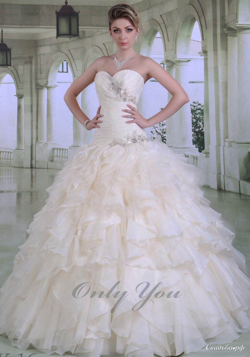 Платье с открытой зоной декольте. Заниженный корсет дополнен лёгкими складками драпировки и ручной вышивкой. Пышная юбка со множеством вертикальных воланов придаёт образу невероятную воздушность.