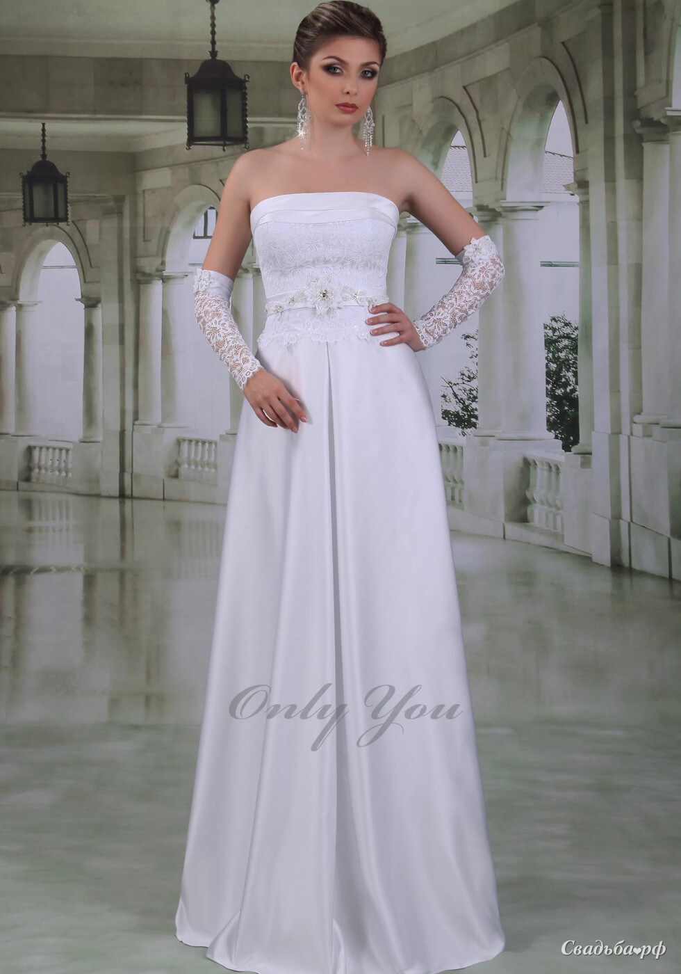 элегантное и стильное свадебное платье из жемчужного атласа, с расшитым пояском.