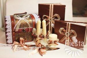 • Свадебные украшения: книга пожеланий, бокалы молодоженов, бутылки, свадебные свечи, сундуки для денег и пр.