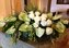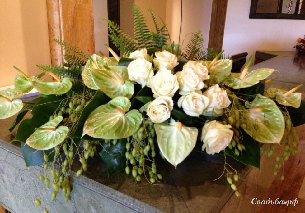 Композиция настольная из белых роз мондиала и зеленого антуриума, с украшением декор.зелени.